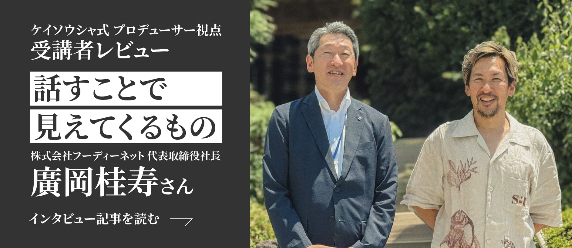 「ケイソウシャ式」では独自のメソッドである「プロデューサー視点」を通して、私たちが過去に経験したような迷いや不安を、今まさに感じているあなたに寄り添いながら、共に解決策を探していきます。社長の価値観やビジョンを理解し、そこに自分がどう関わっていけるのかを考えることができれば、迷いを力に変えることができます。その過程で得られる気づきや成長は、あなたの新しい可能性を開くための大きな一歩となるはずです。自分の価値を再発見し、NO.2として、経営幹部としての役割に新たな意味を見出し、さらに成長できると信じています。